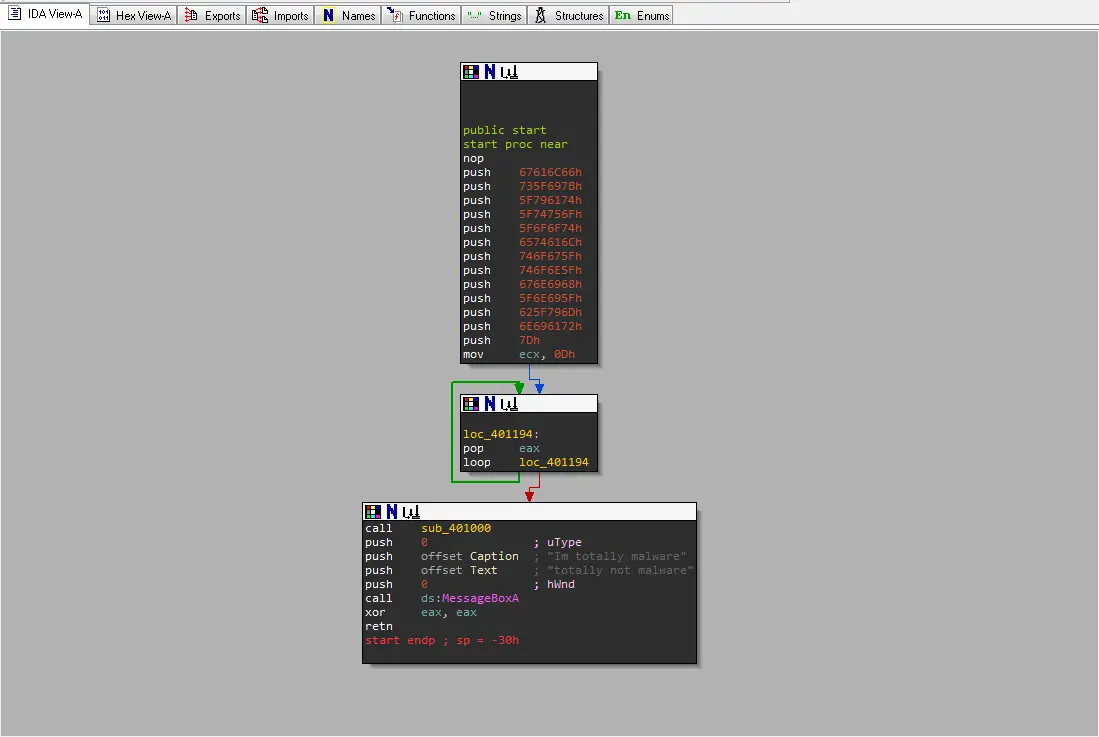 - استخدام تعليمات push بشكل متكرر كتقنية لإخفاء بناء الـ Strings في الذاكرة.