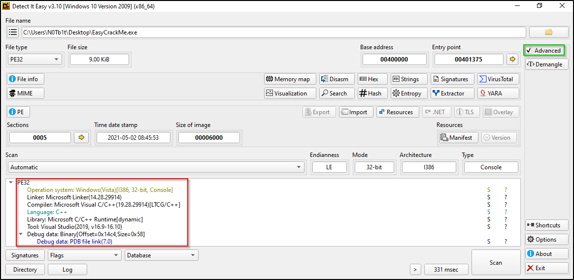 - Detect It Easy (DIE): لمعرفة نوع الملف ونوع المترجم (Compiler) وهل هو ملف مضغوط بـ Packer أم لا. من أهم المؤشرات في هذا البرنامج هو الـ Entropy.