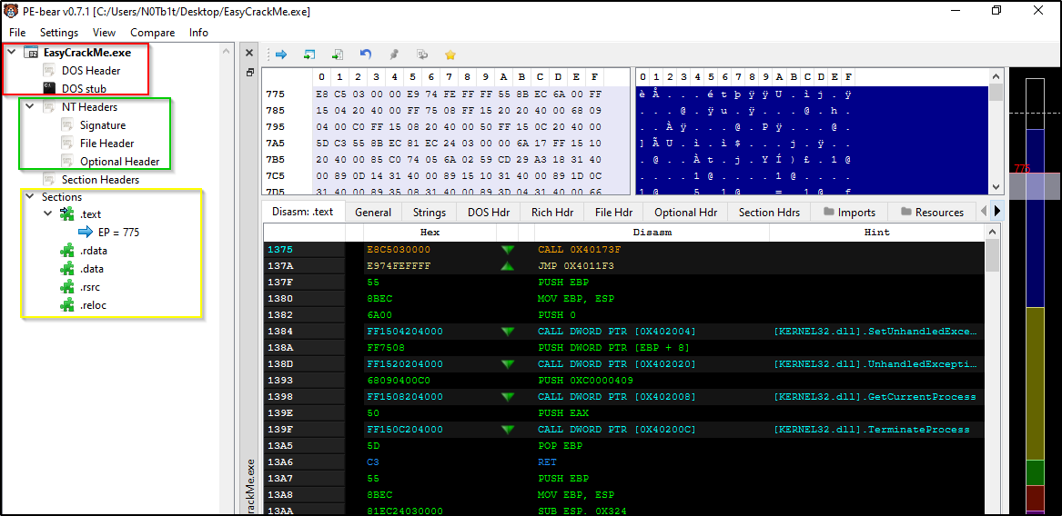 - PE-Bear: يستخدم لتحليل ترويسات الملف (PE Headers) واستكشاف الموارد (Resources) ومعرفة المكتبات (DLLs) والدوال التي يستدعيها البرنامج مثل CreateProcessA.