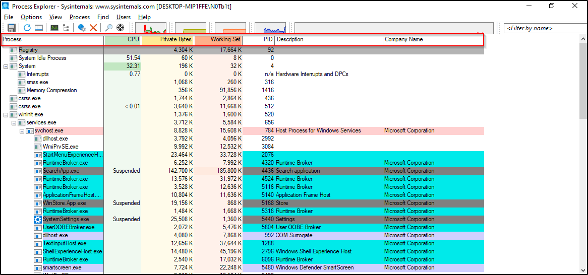 - Process Explorer (ProcExp): يستخدم لمراقبة العمليات النشطة حالياً في النظام واكتشاف أي عمليات مشبوهة.
