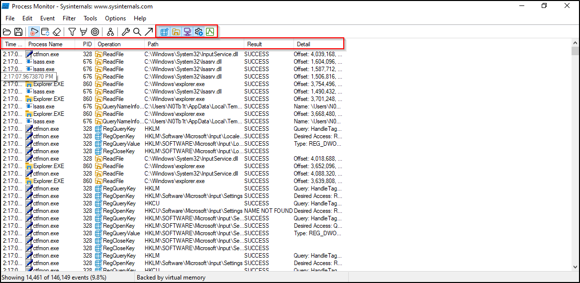 - Process Monitor (ProcMon): يقوم بمراقبة نشاط الملفات وسجل النظام (Registry) وحركة الشبكة في الوقت الفعلي.