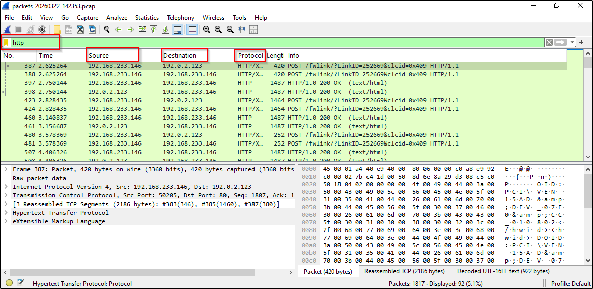 - Wireshark: أداة لالتقاط وتحليل حركة الشبكة (Network Sniffing) لمعرفة ما إذا كان الملف يحاول التواصل مع خوادم خارجية للتحكم والسيطرة.